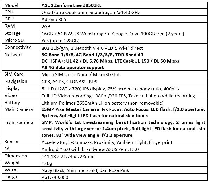 Berikut ini spesifikasi teknis ASUS Zenfone Live: