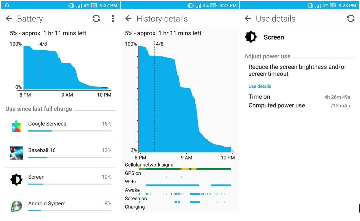 Sebagai gambaran, jika penggunaan normal, yakni untuk media sosial, menjelajah internet, sesekali live streaming atau bermain game, baterainya mampu bertahan hingga sekitar 1 hari. Berikut adalah salah satu hasil pengujian baterai Zenfone Live yang kami lakukan: