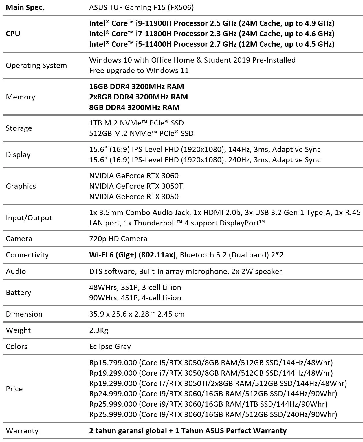Meski diluncurkan bersamaan, namun ketersediaan massal dari TUF Gaming F15 FX506 ini sedikit tertunda. Namun akhirnya kini pengguna sudah bisa menikmatik laptop gaming entry level terbaik Asus, mulai dari versi Core i5 sampai Core i9.